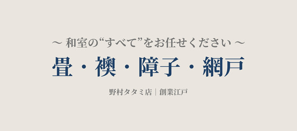 和室の“すべて”をお任せください 畳の張替え・新調はもちろん、 襖(ふすま)・障子・網戸まで一括で承っております。 和室のことなら当店にお任せください。 【対応エリア】 松阪市・津市・伊勢市・多気郡・度会郡 分類 戻る お見積り無料、畳1枚からでも可! お問い合わせください。 0598-21-4770