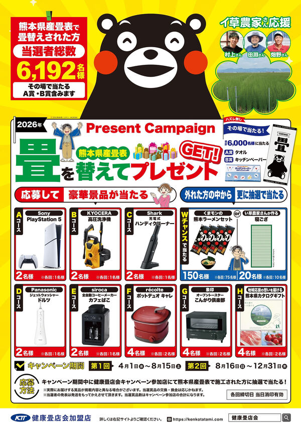 熊本県産の畳表で畳替えをされた方限定で、豪華賞品が当たるキャンペーンが始まります!